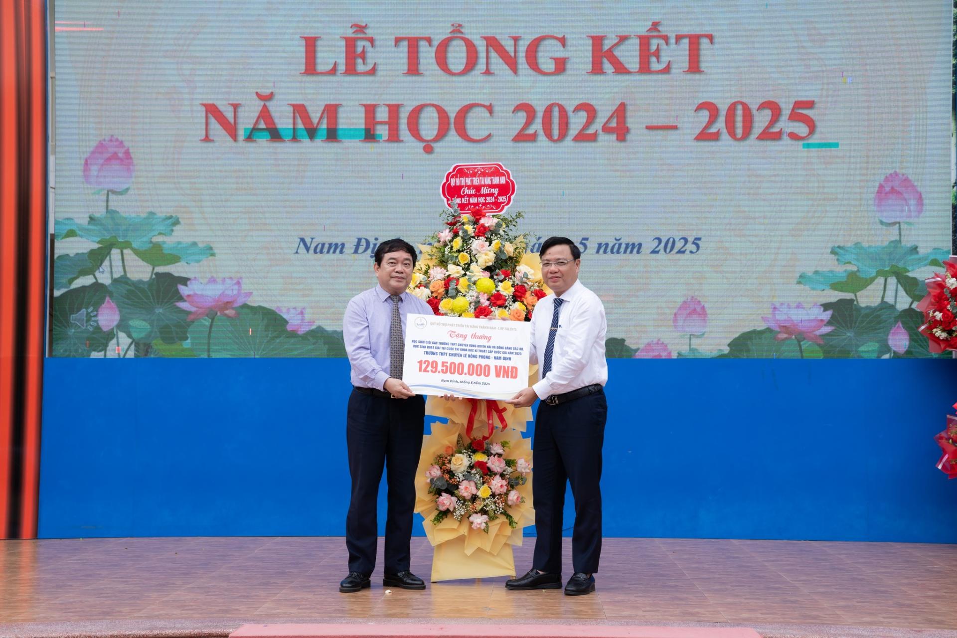 Sáng ngày 26/05/2025, trong không khí long trọng của buổi lễ Tổng kết năm học 2024-2025, Quỹ Hỗ trợ Phát triển Tài năng Thành Nam LHP Talents đã trao thưởng cho các em học sinh trường THPT chuyên Lê Hồng Phong, Nam Định đạt thành tích cao trong Kỳ thi học sinh giỏi các trường THPT chuyên khu vực Duyên hải và Đồng bằng Bắc Bộ, Kỳ thi Khoa học Kỹ thuật cấp Quốc gia năm 2025.