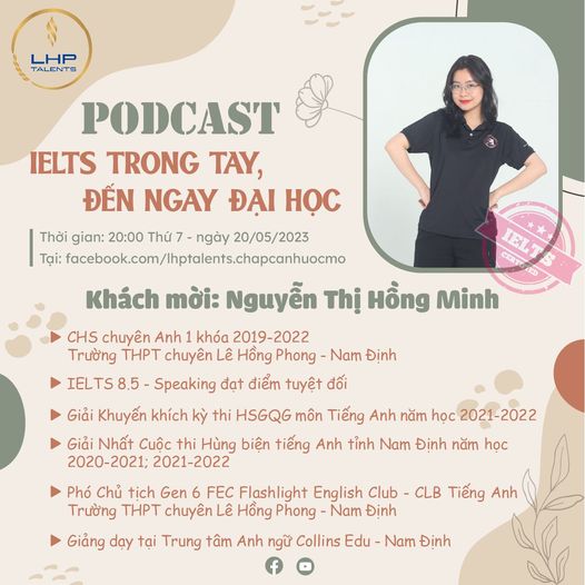 Đồng hành cùng LHP Talents trong số podcast đầu tiên là bạn Nguyễn Thị Hồng Minh - CHS LHP khóa 2019-2022, sinh viên năm nhất chuyên ngành Kinh tế Đối ngoại, Đại học Ngoại thương.