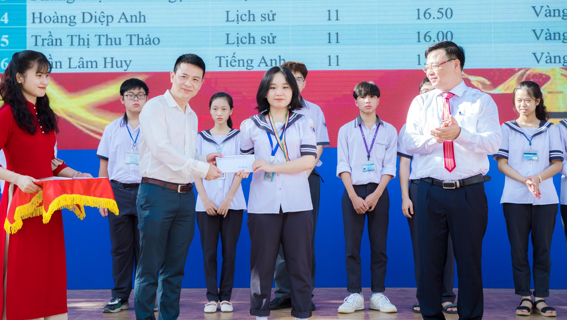 Sáng ngày 24/7/2023, tại buổi lễ chào cờ đầu tuần trường THPT chuyên Lê Hồng Phong - Nam Định, đại diện Quỹ Hỗ trợ phát triển tài năng Thành Nam - Giám đốc Quỹ Nguyễn Việt Cường đã chúc mừng và khen thưởng các học sinh đạt giải trong các kì thi chọn HSG Olympic Hóa học quốc tế và khu vực Duyên hải và Đồng bằng Bắc Bộ 2023.